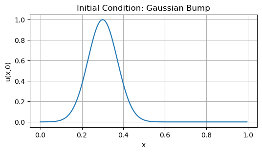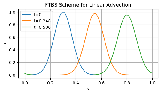 # TRY IT 1: Implement FTCS for linear advectiondef ftcs_advection(u0, c, dx, dt, nt):'''TODO: Implement the Forward-Time, Central-Space scheme for u_t + c u_x = 0 with periodic BCs. ''' N =len(u0) u = u0.copy() lambda_c = c * dt / dx history = [u.copy()]for n inrange(nt):# TODO: add the line below with the FTCS update:# u_new = u_new = u.copy() # placeholder history.append(u_new.copy()) u = u_newreturn np.array(history)# After you implement ftcs_advection, uncomment these lines to test:# history_ftcs = ftcs_advection(u0, c, dx, dt, nt)# plt.figure(figsize=(6, 3))# plt.plot(x, u0, label="t=0")# plt.plot(x, history_ftcs[nt//2], label=f"t={dt*(nt//2):.3f}")# plt.plot(x, history_ftcs[-1], label=f"t={dt*nt:.3f}")# plt.xlabel("x")# plt.ylabel("u")# plt.title("FTCS Scheme for Linear Advection (Expected to be Unstable)")# plt.legend()# plt.grid(True)# plt.show()