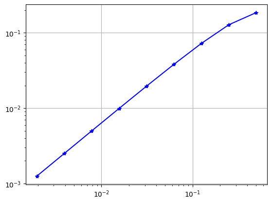 plt.loglog(H,AbsPctError,'b-*') # Why are we build a loglog plot?